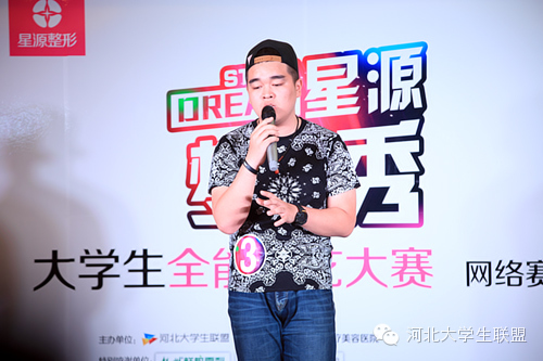 2015年5月9日,由河北大学生联盟携手石家庄星源医疗美容医院共同举办的大型高校公益活动网络赛区入围赛在石家庄星源医疗美容医院多功能厅拉开了帷幕。在这里聚集了一群有梦想并且坚持梦想的人,就在今天,他们将在z绚丽的灯光下,为自己的舞台梦想加冕。敢秀你就来,有梦想就有舞台!让我们一起来享受他们用青春的激情和美丽的梦想为大家奉献的赏心悦目的饕餮盛宴吧。